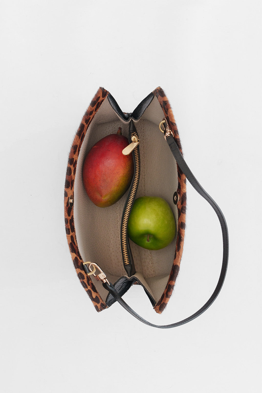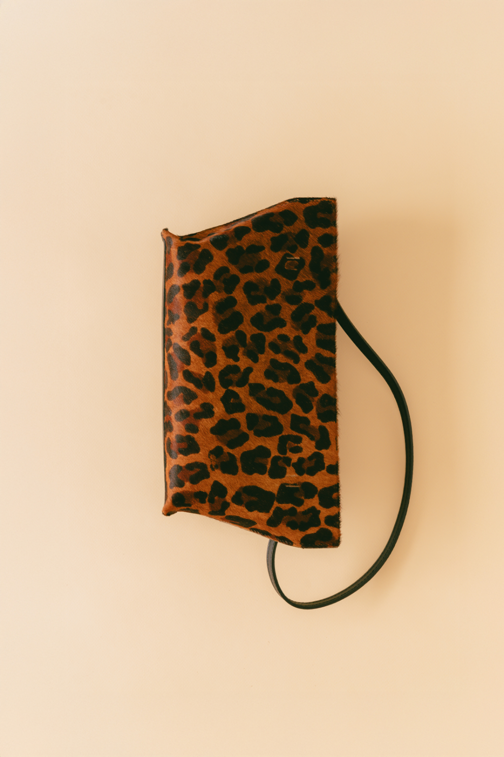 La cartera María nace de un gesto artesanal, moldeada en cuero vacuno con pelo y estampa leopardo que guarda, en su interior, el tacto suave del cuero de cerdo lustrado color crudo. Su estructura, ligera pero firme, equilibra el carácter clásico con una elegancia contemporánea.