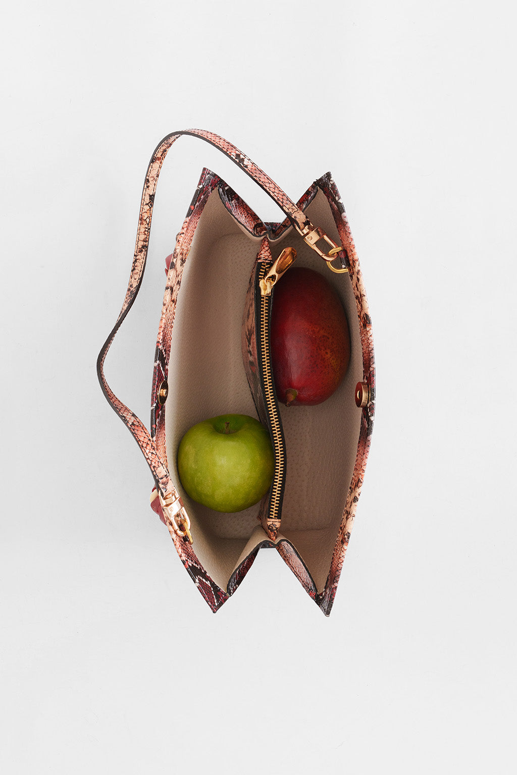 Confeccionada artesanalmente en cuero vacuno estampa italiana de pitón, guarda en su interior un suave cuero de cerdo lustrado color crudo, que protege un diseño estructurado y liviano.