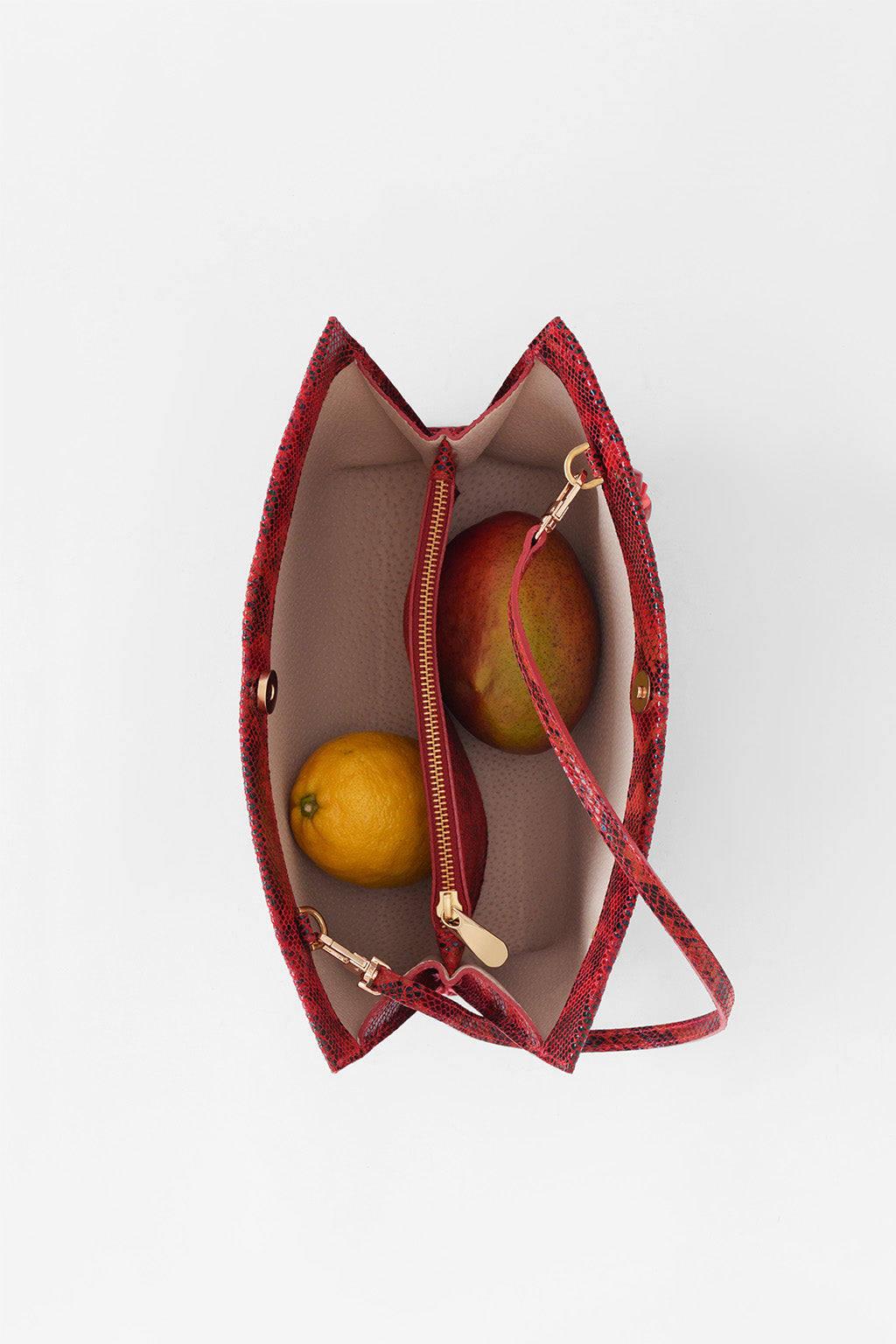 Confeccionada artesanalmente en cuero vacuno estampa de pitón, guarda en su interior un suave cuero de cerdo lustrado color crudo, que protege un diseño estructurado y liviano.