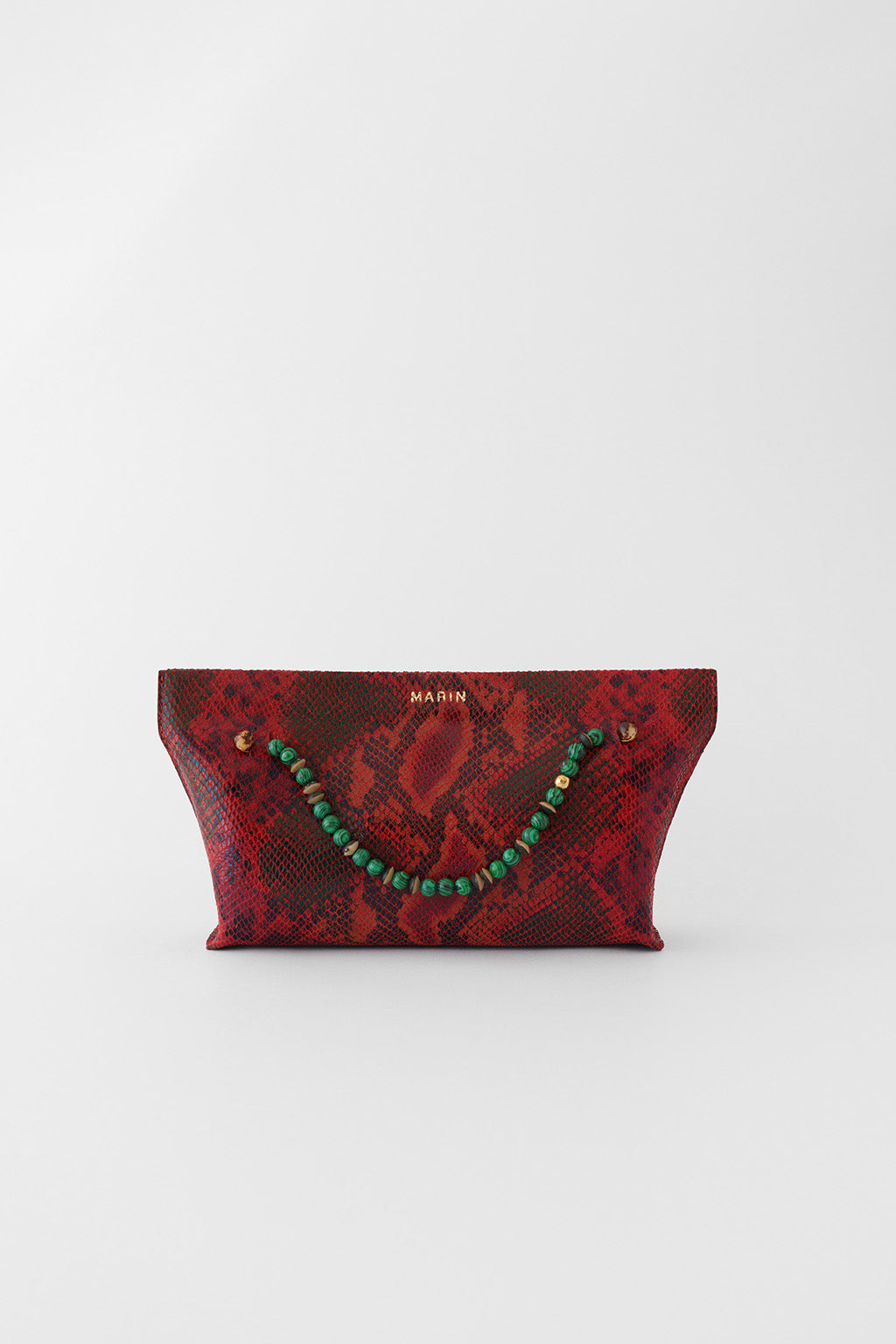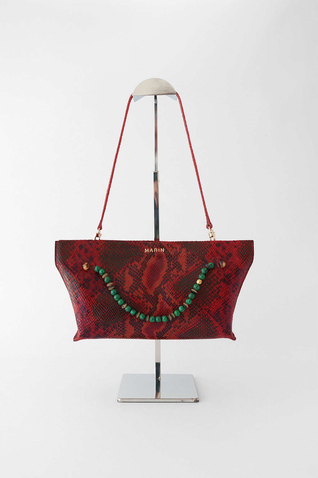 Los herrajes bañados en oro enmarcan el bordado frontal en malaquita, bronce y semillas, detalle que resaltan un objeto de deseo.