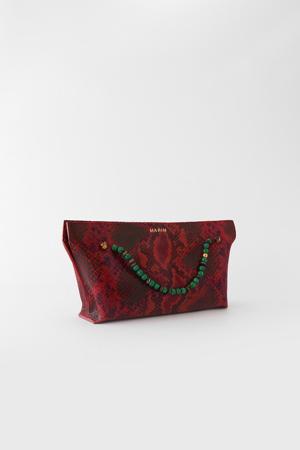 Confeccionada artesanalmente en cuero vacuno estampa de pitón, guarda en su interior un suave cuero de cerdo lustrado color crudo, que protege un diseño estructurado y liviano.