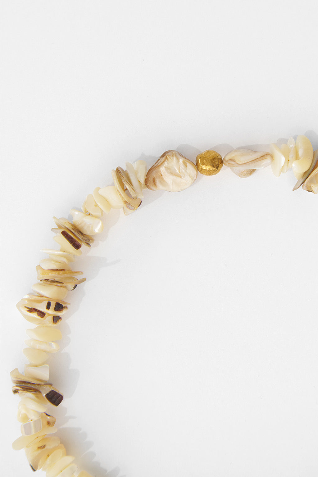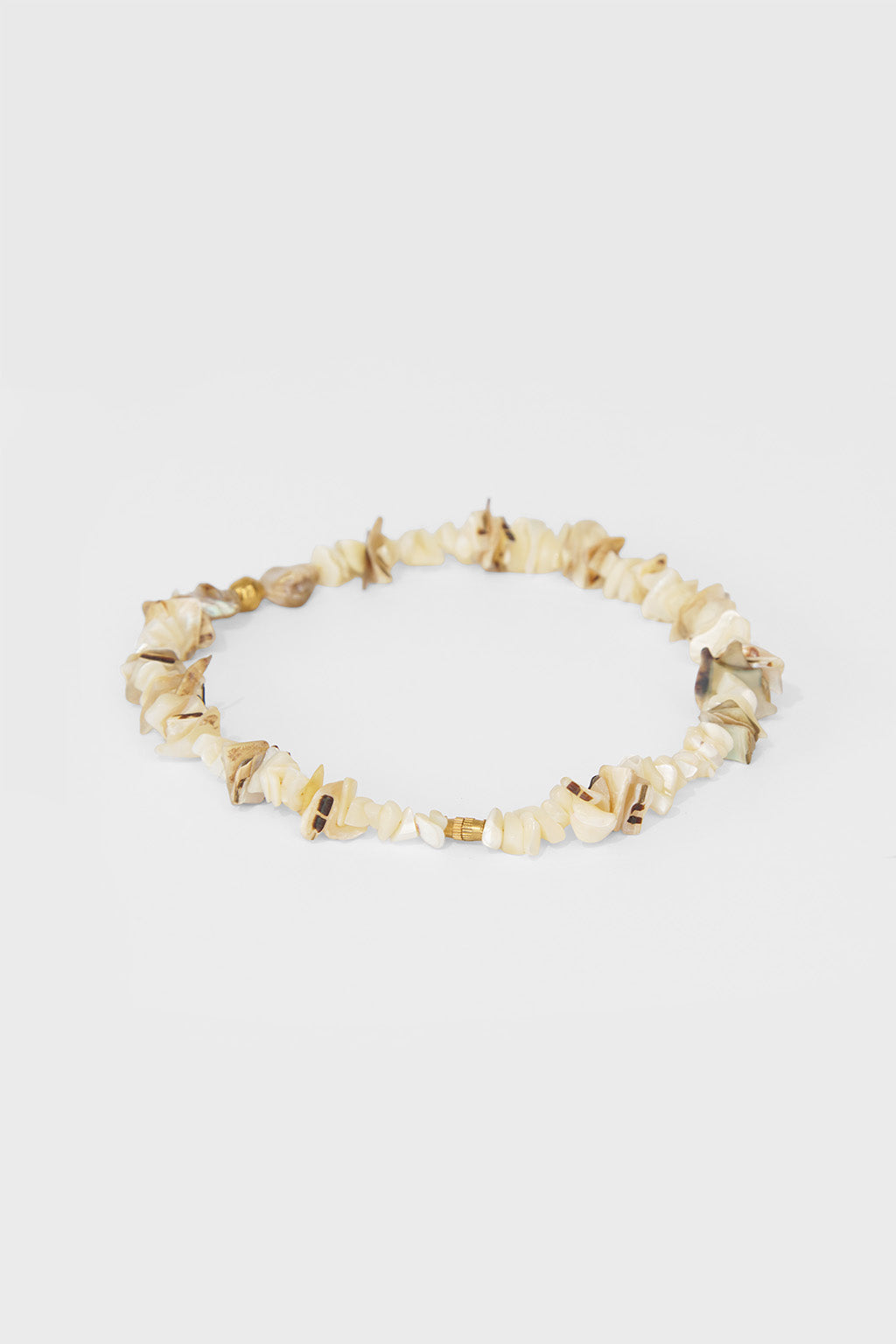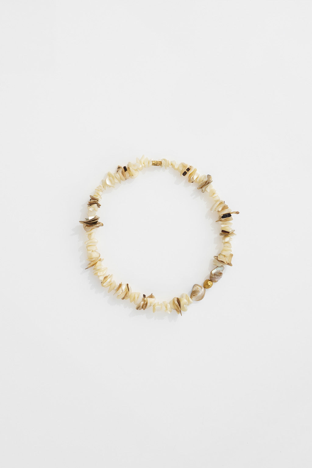 En la superficie del agua, la luz revela secretos que el océano resguarda desde siempre. Inspirado en esa danza silenciosa entre la claridad y la profundidad, nace este collar hecho a mano en bronce y nácar, donde la nobleza de los materiales encuentra su forma en un diseño sereno y natural.