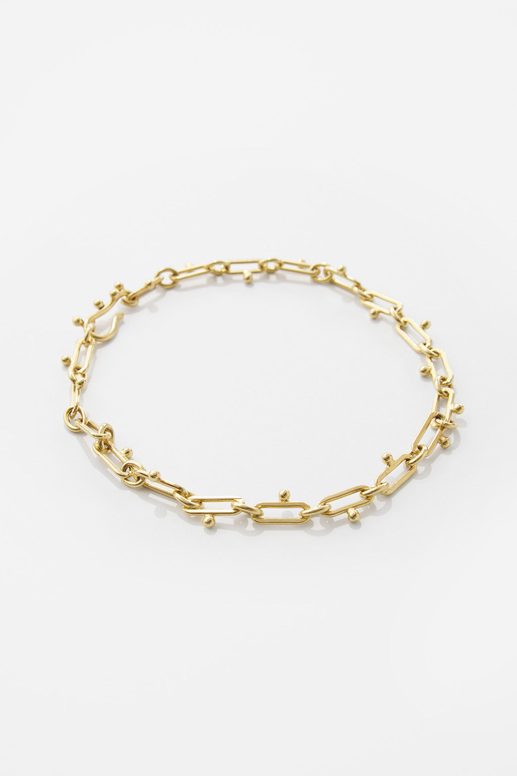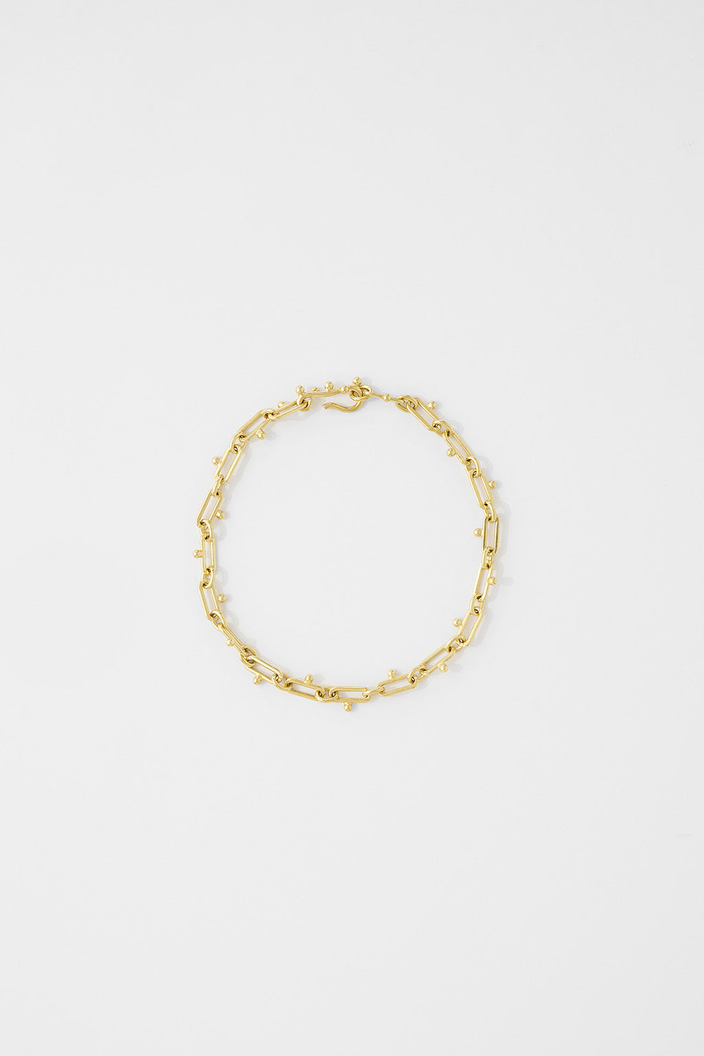 Como corales que ascienden lentamente por el lecho marino, las esferas de bronce soldadas a mano se entrelazan en este collar, evocando la vida secreta que habita en las profundidades. Cada esfera es un destello, un pequeño universo que guarda la memoria del mar.