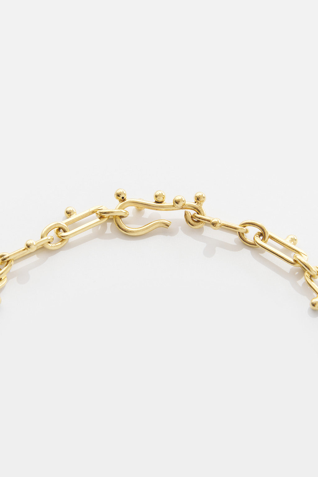 La pieza se sostiene en una cadena limada, creada en máquinas italianas de joyería, cuya precisión técnica acompaña con elegancia el gesto artesanal.
