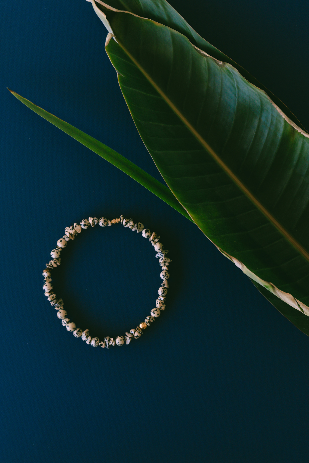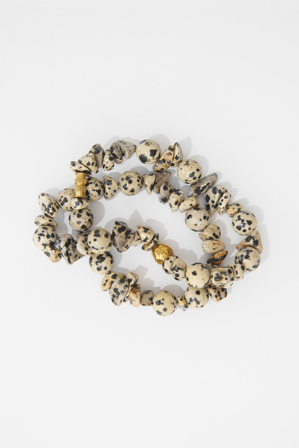 El mar guarda en sus profundidades secretos de fuego y piedra. Este collar, hecho a mano en bronce y jaspe dálmata, evoca la fuerza de la naturaleza que lo vio nacer: un mineral único, salpicado de manchas negras que emergen de la unión con otros elementos, como la turmalina y la arfvedsonita.